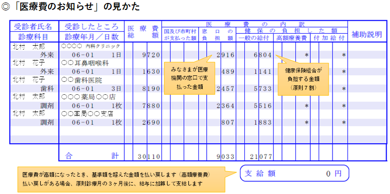 健康保険組合は、医療機関にかかった方へ「医療費のお知らせ」を発行しています。「医療費のお知らせ」には、私たちが保険証で診療を受けたときの医療費と保険給付金の明細が記載されています。内容についての疑問は、健康保険組合へ問い合わせください。